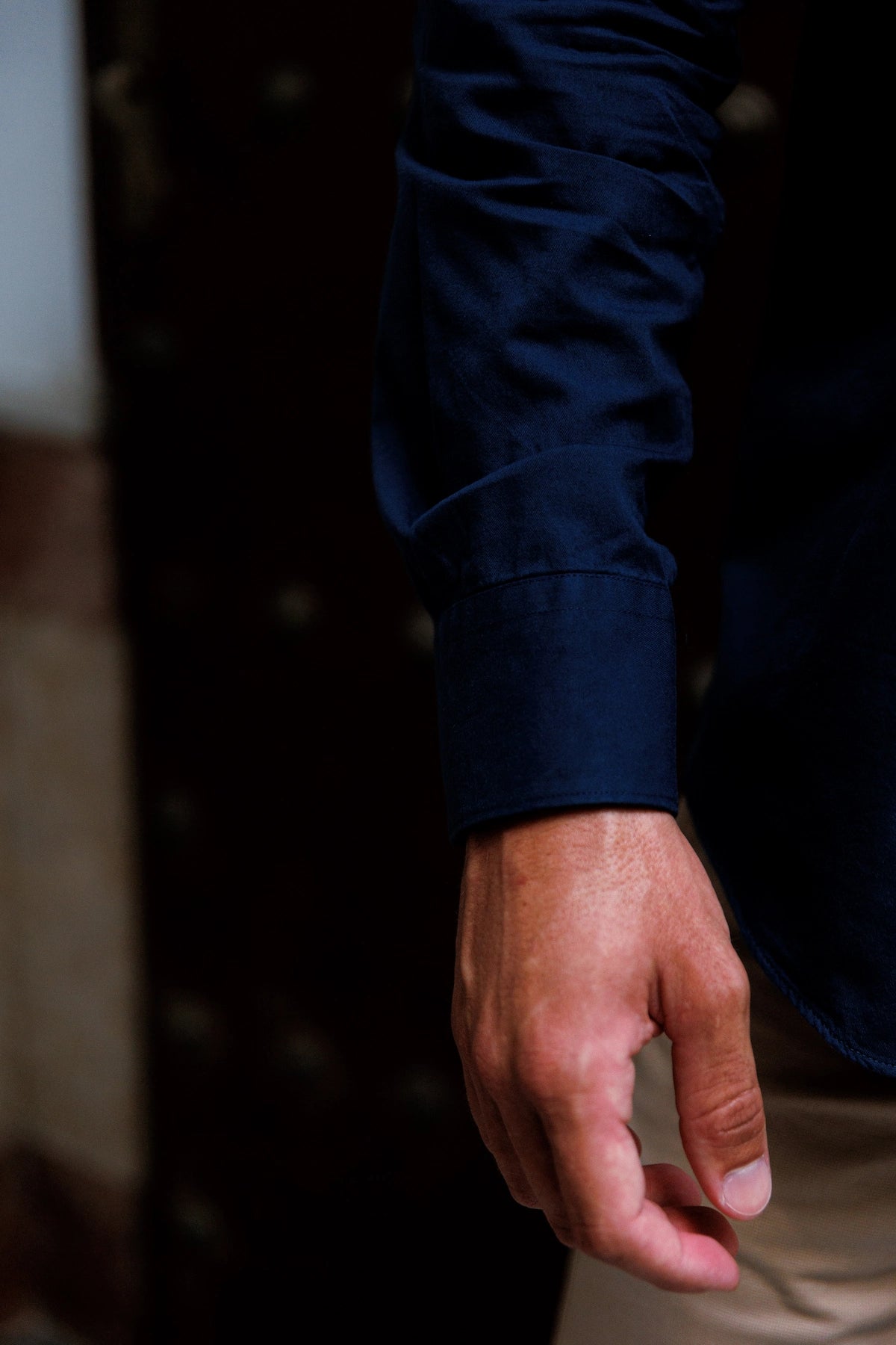 Camisa de Algodón 100 por 100 con cuello italiano y botonadura oculta. Este color Azul Marino es perfecto para lucir con chinos, chaqueta o un look más informal.